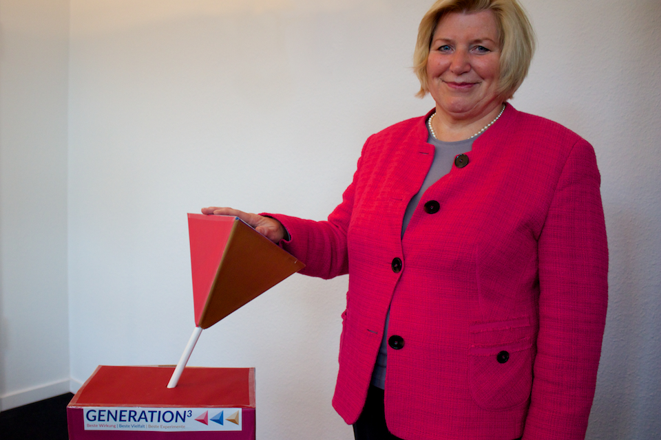 Die Ministerin startete mit einem Tetraeder-Druck symbolisch die Homepage www.generationhochdrei.de und damit offiziell das neue Jugend-Förderprogramm Generation3. Das neue Programm folgt ab 1. Januar 2015 dem zum Jahresende auslaufenden Programm Generation 2.0.